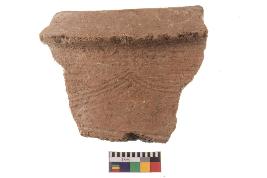 | Description / विवरण | Specimen of red ware with engraved decorative Joint curves geometric design. |