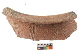 | Description / विवरण | Specimen of red ware with engraved decorative Parallel horizontal lines and triangles geometric design. |