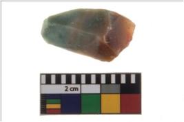 | Description / विवरण | A partially broken specimen of a chunk of a semiprecious stone Jasper. It is having greenish-reddish colour shade. It is having n-6 flake scar marks on its surface. It is having a shiny, glossy and smooth surface. |