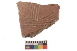 | Description / विवरण | Specimen of red ware with engraved decorative Parallel vertical lines intersecting curves geometric design. |