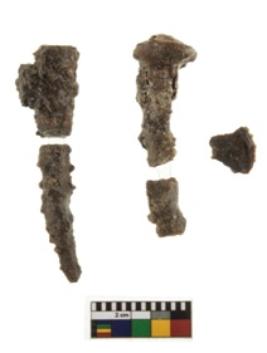 | Description / विवरण | There are n-2 specimens of nails. Both are fragmented and heavily rusted. a This nail is a complete specimen but is fragmented into three parts. The butt of the nail is circular and convex. The nail itself is rectangular at the top and tapers into a point at the tip. b This specimen is broken in two parts and is rectangular atop and tapers towards the bottom. The butt and the tip of the nail have broken off. |