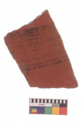 | Description / विवरण | Specimen of red ware with decorative black pigment. |