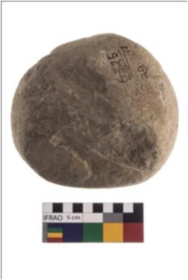 | Description / विवरण | A partially broken specimen of roughly round shaped hammerstone with battered periphery along with the circumference. It is used on all sides. It is made up of quartz. |
