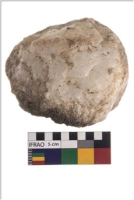 | Description / विवरण | A partially broken specimen of round shaped hammerstone with battered periphery along with the circumference. It is broken from middle portion. It is made up of quartz. |