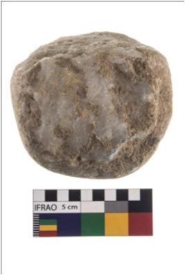| Description / विवरण | A partially broken specimen of roughly round shaped hammerstone with battered periphery along with the circumference. It is used on all sides. It is made up of quartz. |