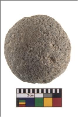 | Description / विवरण | A partially broken specimen of round shaped slingball with battered periphery along with the circumference. It is broken from middle portion. It is made up of sandstone. |