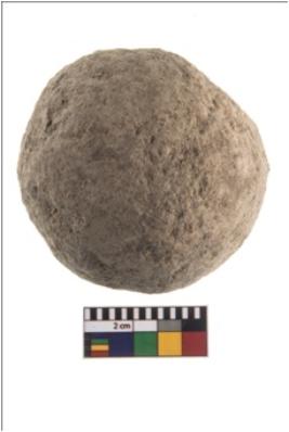 | Description / विवरण | A partially broken specimen of round shaped slingball with battered periphery along with the circumference. It is broken from middle portion. It is made up of quartz. |