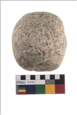 | Description / विवरण | A partially broken specimen of roughly round shaped hammerstone with battered periphery along with the circumference. It is made up of quartz. |