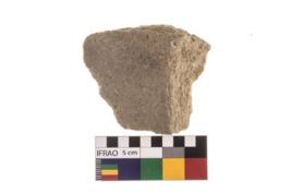 | Description / विवरण | A broken specimen of a irregular shaped mueller stone with battered surfaced. |
