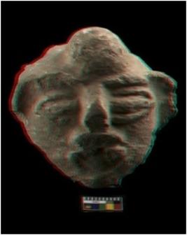| Description / विवरण | It is a complete mask depicting a human face. The facial features show big and protruding eyes, Short nose and thick lips. Ears are prominent and flaking, the knob on the forehead is intact, it might be a decorative knob. There is a lime coating all over, and traces of red painting. This specimen is slightly smaller and worn out. |