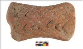 | Description / विवरण | A complete specimen of double axe head shaped skin rubber with chevron design over its both side. It is red ware and well fired. |