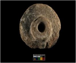 | Description / विवरण | The specimen is a thick wheel, rectangular in section, broad at circumference and with prominent hubs on both sides. It is well crude and coarse red. |