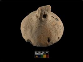 | Description / विवरण | The specimen is a complete circular lid with a concave base. It has a pinched hold on the outer surface. A circular perforation goes through the hold. |