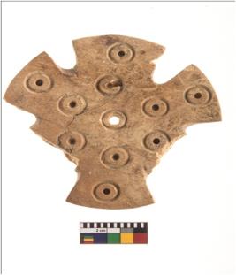 | Description / विवरण | A partially broken specimen of a pendant, with six petals in the circumference of 66.04mm, amongst them two are broken and a perforation at the centre. It is a thick decorative piece of bone, smooth surface. It bears a circular groove design on its surface. |