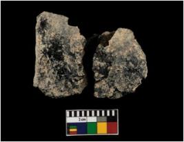 | Description / विवरण | The specimen are fragments of a terracotta crucible. It is concave on both outside and inside. It is made of coarse black fabric. |