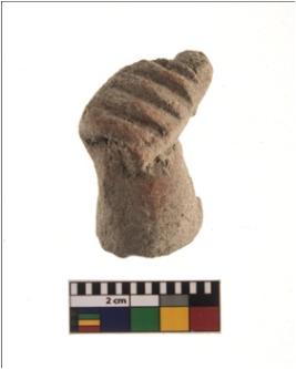 | Description / विवरण | A partially broken specimen of an arm of a human figurine. It ends in a clenched fist with outstretched thumb and was probably the right arm of a figurine. It is a proper depiction of five fingers of hand. It is made of fine clay, reddish in colour. This speciemen is well fired and smooth in texture. |