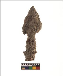 | Description / विवरण | A partially broken specimen of a iron arrowhead with a kite shaped head with two small projections on its sides and broken tang, with slanting sides tapering to a sharp point. This speciemen is heavily corroded and rough in texture. |