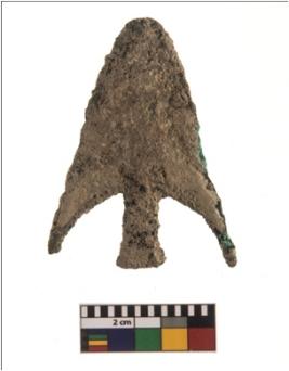 | Description / विवरण | A partially broken specimen of a leaf shaped copper arrowhead with straight sides, rounded tip and two projectile points on its lower portion. Its tang is broken. It is heavily corroded and having rough surface. |