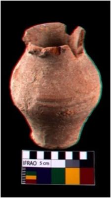 | Description / विवरण | A miniature water vessel with a carinated belly and a short flat base. Its fabricx is a coarse dirty clay indifferently baked. |