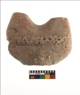 | Description / विवरण | A partially broken specimen of a lower portion of a handmade female figurine. Only the portion below the waist has survived. It is slipped in red. The speciemen bears a girdle denoted by an appliqued band with impressed dots. It iswell fired and having rough surface. |