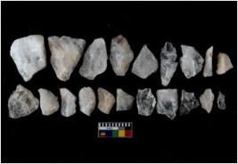 | Description / विवरण | There are n-20 of intact flake cores made up of Quartz. Some of them have bulge of percussion and some are flat flakes. |