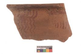 | Description / विवरण | Specimen of red ware with decorative wavy line pattern |