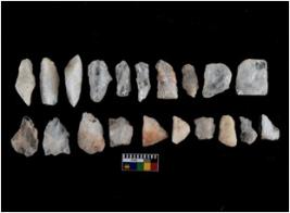 | Description / विवरण | There are n-20 of intact flake cores made up of Quartz. Some of them have bulge of percussion and some are flat flakes. |