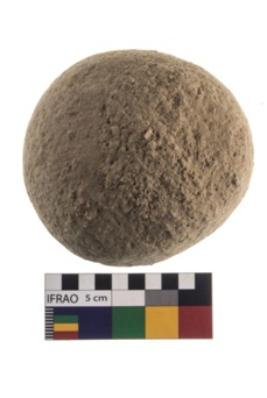 | Description / विवरण | A partially broken specimen of roughly round shaped hammer stone with battered periphery along with the circumference. |