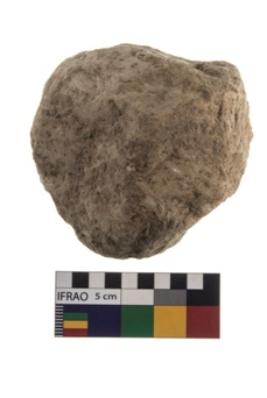 | Description / विवरण | A partially broken specimen of roughly round shaped hammer stone with battered periphery along with the circumference. |