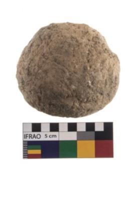 | Description / विवरण | A partially broken specimen of roughly round shaped hammer stone with battered periphery along with the circumference. |