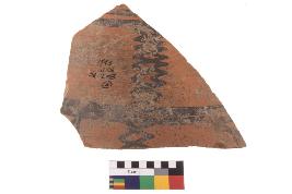 | Description / विवरण | Specimen of black on red ware with black decorative Criss cross lines geometric painting. |