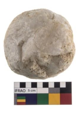 | Description / विवरण | A partially broken specimen of roughly round shaped hammer stone with battered periphery along with the circumference. |