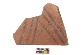 | Description / विवरण | Specimen of black on red ware with black decorative Parallel cross lines geometric painting. |
