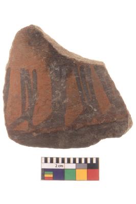| Description / विवरण | Specimen of black on red ware with black decorative Joint curves with long spikes geometric painting. |