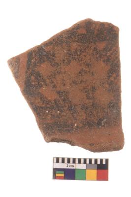 | Description / विवरण | Specimen of black on red ware with black decorative Lattice pattern geometric painting. |