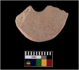 | Description / विवरण | A partially broken specimen of disc shaped terracotta net sinker. It is wheel-made with well-levigated clay. The perforation widens near the edges and narrows inside. It is having rough surface and reddish in colour. It is coarse and well fired. |