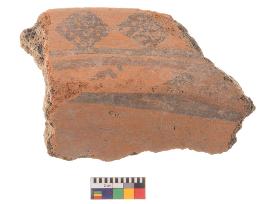 | Description / विवरण | Specimen of black on red ware with black decorative Joint lattice squares and triangles between parallel lines geometric painting. |