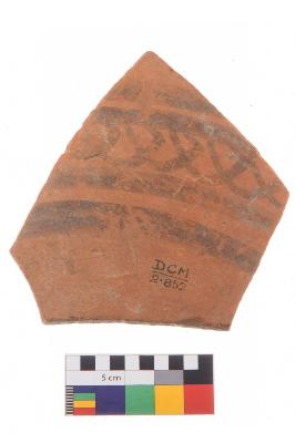 | Description / विवरण | Specimen of black on red ware with black decorative Intersecting curves between parallel lines geometric painting. |