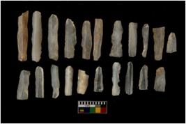 | Description / विवरण | 20 chalcedony blades with retouch all along on both sides. |