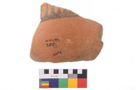 | Description / विवरण | Specimen of black on red ware with black decorative Joint long spikes geometric painting. |