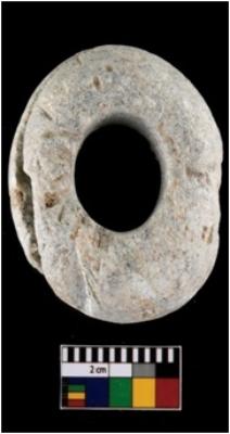| Description / विवरण | A partially broken specimen of circular shaped schist net sinker. It is protruding at the mid part and the base and upper portion is smaller in diameter than the mid part. The top and bottom are coarse, but the sides have been worn smooth. The perforation widens near the edges and narrows inside. It is relatively heavy. It is having smooth surface, greyish in colour. It is having abrasion marks on its surface. |