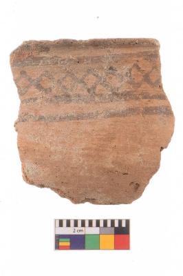| Description / विवरण | Specimen of black on red ware with black decorative Lattice pattern geometric painting. |
