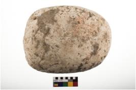 | Description / विवरण | A Partially broken specimen of a oval shaped Grinder stone with Oval section.It heaving battered surfaced and one side is flat. |