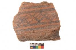 | Description / विवरण | Specimen of black on red ware with black decorative Joint lattice squares geometric painting. |