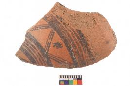 | Description / विवरण | Specimen of black on red ware with black decorative joint triangles and sun motif between it nature and geometric painting. |