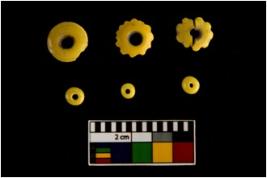| Description / विवरण | There are n-6 of beads. Out of them 3 are concave biconical yellow discs and 2 are short barrel yellow beads made up of Glass. All are in intact condition. |