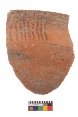 | Description / विवरण | Specimen of black on red ware with black decorative Parallel wavy lines geometric painting. |