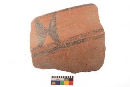 | Description / विवरण | Specimen of black on red ware with black decorative Joint triangles geometric painting. |