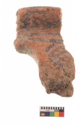 | Description / विवरण | Specimen of black on red ware with black decorative Lattice pattern geometric painting. |