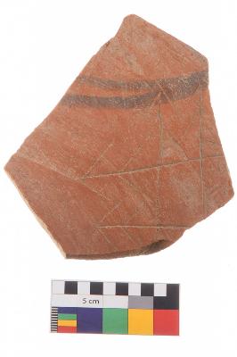 | Description / विवरण | Specimen of black on red ware with black decorative geometric painting and engraved intersecting arrows design. |